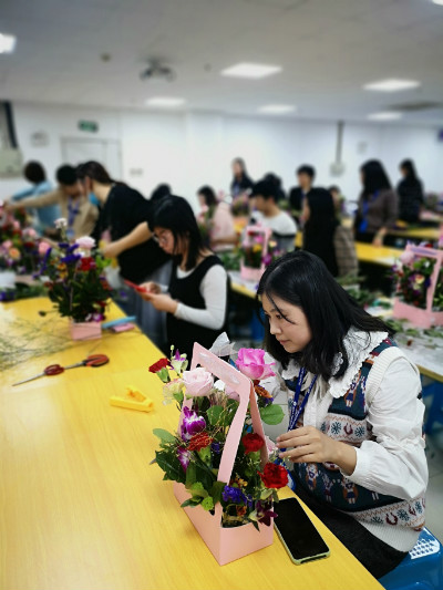 活動(dòng)現(xiàn)場(chǎng),花藝?yán)蠋熛虼蠹以敿?xì)講解了花藝知識(shí)及插花技巧,并進(jìn)行操作演示。 在花藝?yán)蠋煹闹笇?dǎo)下,大家開始認(rèn)真修剪枝葉、設(shè)計(jì)造型,發(fā)揮自己的想象及創(chuàng)造力,通過悉心修剪和巧妙的組合,一盆盆典雅的花束悄然綻放。