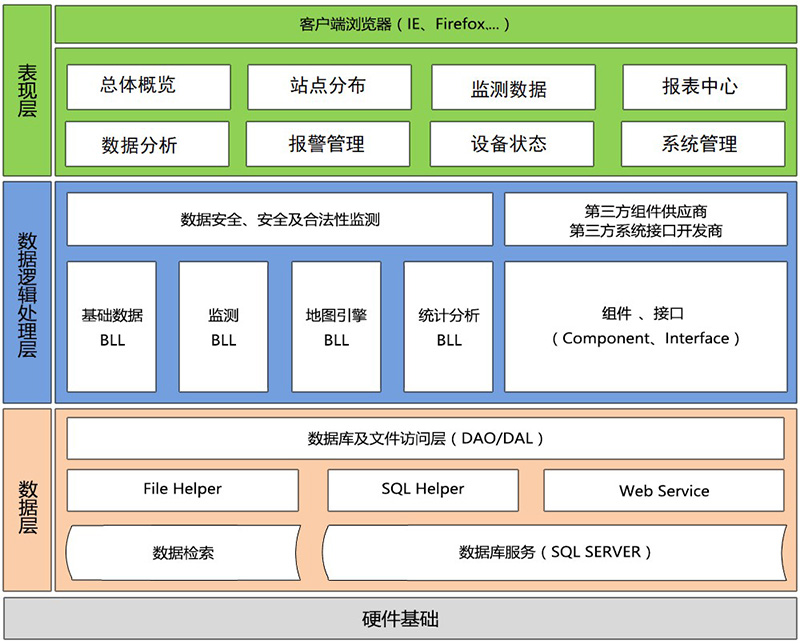 平臺(tái)采用B/S結(jié)構(gòu),實(shí)現(xiàn)基于GIS的面向水質(zhì)在線監(jiān)控系統(tǒng),能夠及時(shí)掌控各重點(diǎn)水質(zhì)監(jiān)測點(diǎn)位水溫、pH、溶解氧、電導(dǎo)率、濁度、高錳酸鹽指數(shù)、總有機(jī)碳(TOC)、氨氮數(shù)據(jù)狀況。系統(tǒng)的主要功能模塊包括:站點(diǎn)分布、監(jiān)測數(shù)據(jù)、總體概覽、報(bào)表管理、數(shù)據(jù)分析、排放分析、報(bào)警管理和系統(tǒng)管理。