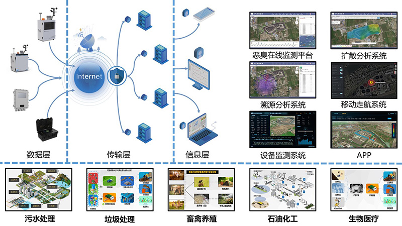 通過(guò)安裝惡臭在線監(jiān)測(cè)系統(tǒng),可以實(shí)時(shí)在線監(jiān)測(cè)環(huán)境空氣,掌握污染物特征,建立預(yù)警管理系統(tǒng),追溯污染排放源,制定減排方案。系統(tǒng)可廣泛應(yīng)用于化工園區(qū)、垃圾填埋場(chǎng)、污水處理廠、石油煉化、食品生產(chǎn)廠家、生物醫(yī)藥生產(chǎn)廠家、畜牧養(yǎng)殖廠、醫(yī)院等場(chǎng)合。