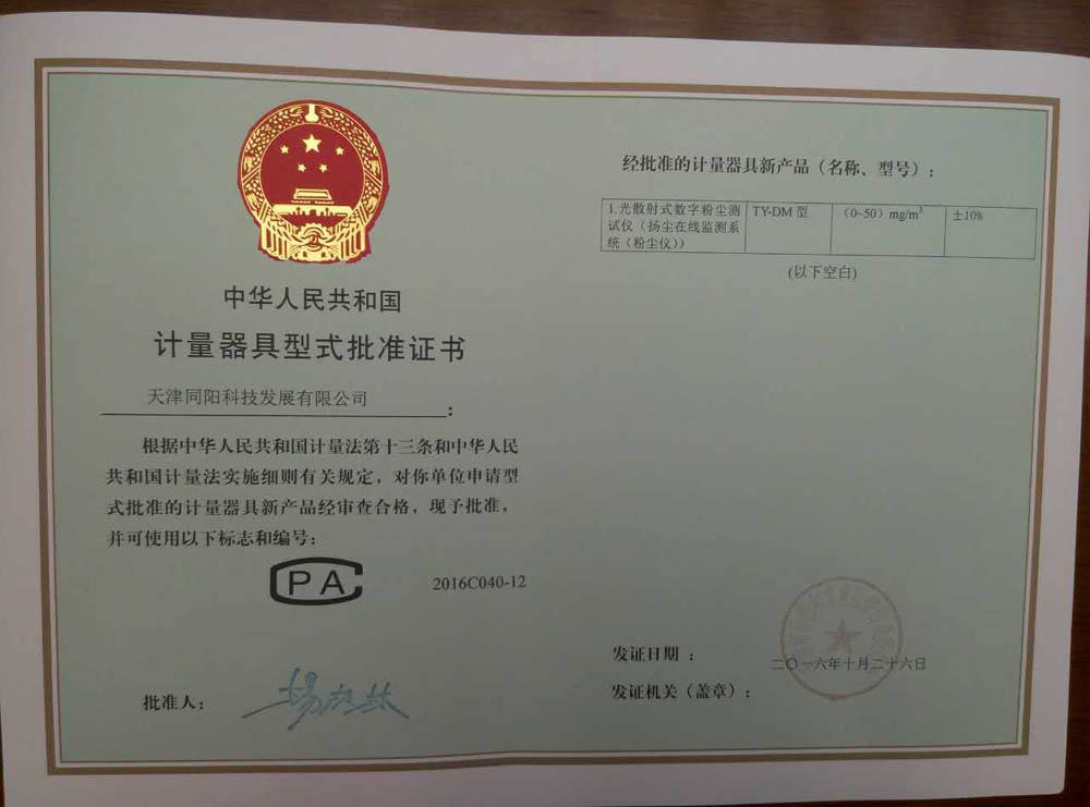 天津同陽TY-DM型揚塵在線監(jiān)測系統(tǒng)取得計量器具型式批準證書