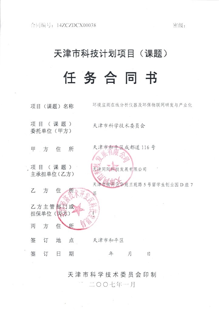 2014年11月19日,由天津同陽(yáng)科技發(fā)展有限公司牽頭的“環(huán)境監(jiān)測(cè)在線分析儀器及環(huán)保物聯(lián)網(wǎng)研發(fā)與產(chǎn)業(yè)化”項(xiàng)目,經(jīng)天津市科學(xué)技術(shù)委員會(huì)批準(zhǔn)列入“2014年天津市科技支撐計(jì)劃重點(diǎn)項(xiàng)目”,在“資源環(huán)境”領(lǐng)域獲得立項(xiàng)支持。